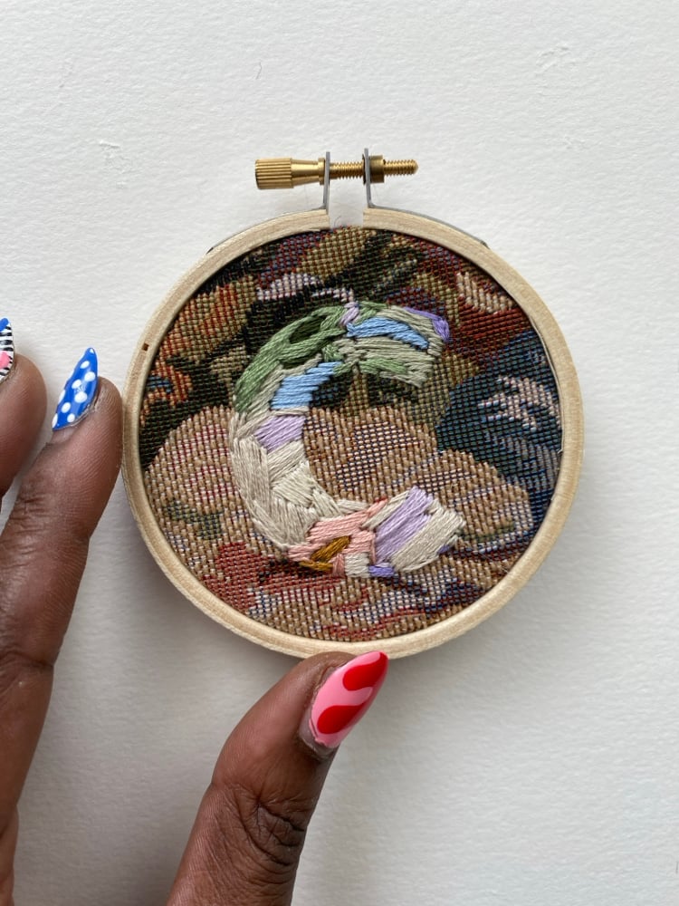 Original hand embroidery artwork of the letter “C” on floral tapestry fabric. Framed in embroidery hoop.