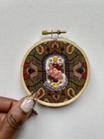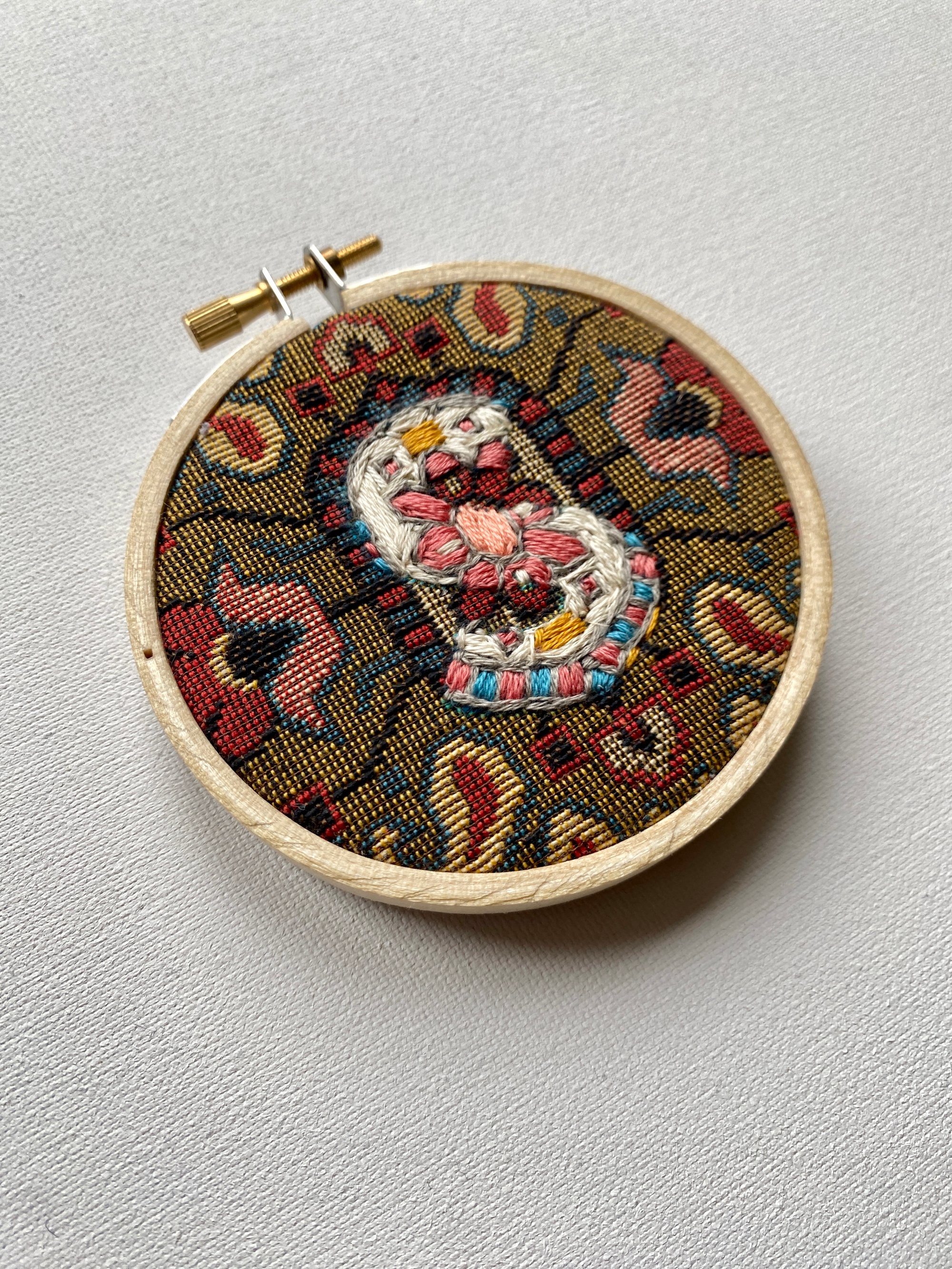 Cotton tapestry fabric, embroidery floss, wood embroidery hoop. 2026.