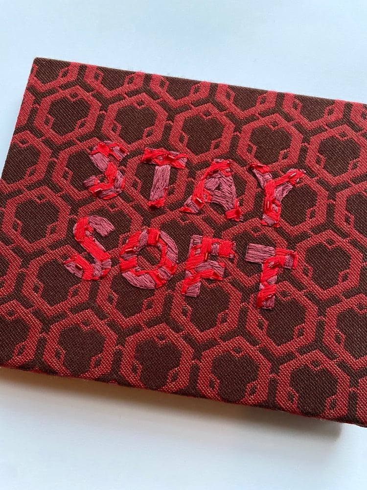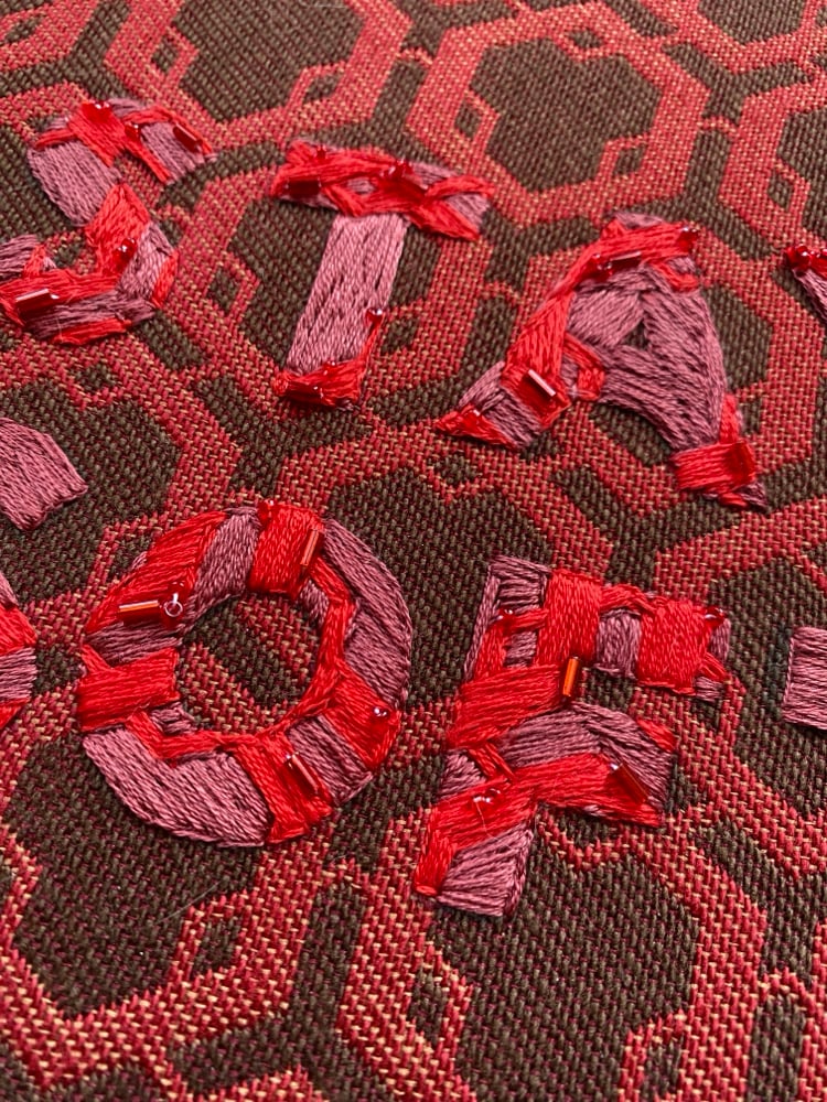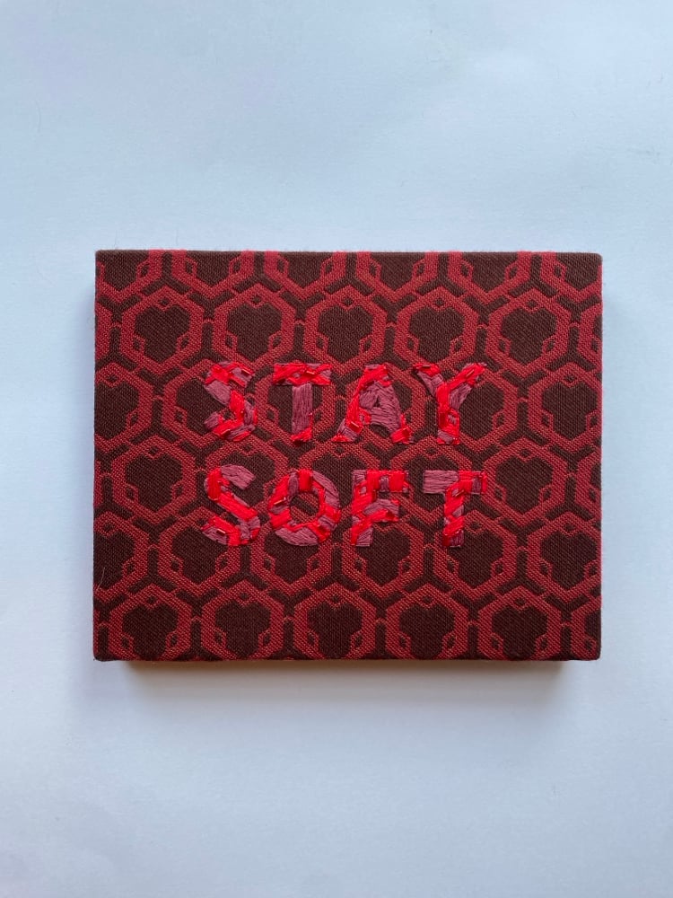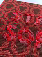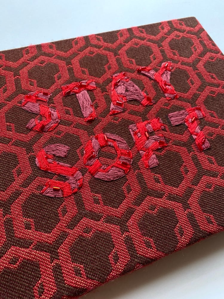 Original Secret Word Embroidery Artwork - “STAY SOFT” (Red Geometric Tapestry)
